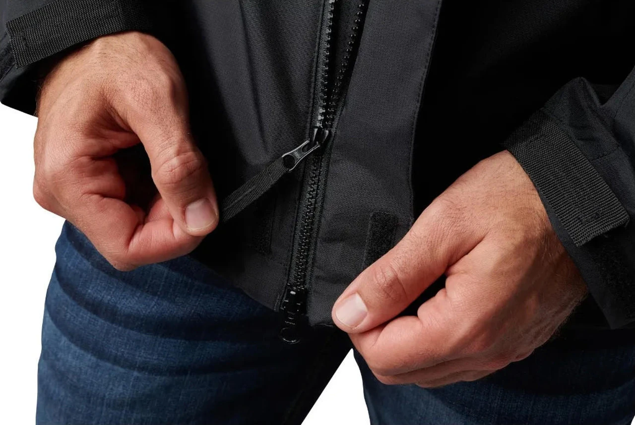 The 5.11 Tactical Men’s Exos Waterproof Rain Shell Jacket 48370 gets you through the heaviest downpours at bay thanks to rugged 20K waterproof and 10K breathable 2.5L ripstop fabric with DWR finish that is seam-sealed from top to bottom. This rain shell won’t weigh you down when you’re on the move and stows small after the mission is complete. A pair of external zippered hand pockets provide storage for your phone, flashlight and other gear. The stationary hood is adjustable, along with the hem – using internal shock cord systems. A reinforced brim on the hood keeps rain off your face. The external and internal storm flaps and chin guard provide extra protection, while cuff tabs help seal out water.